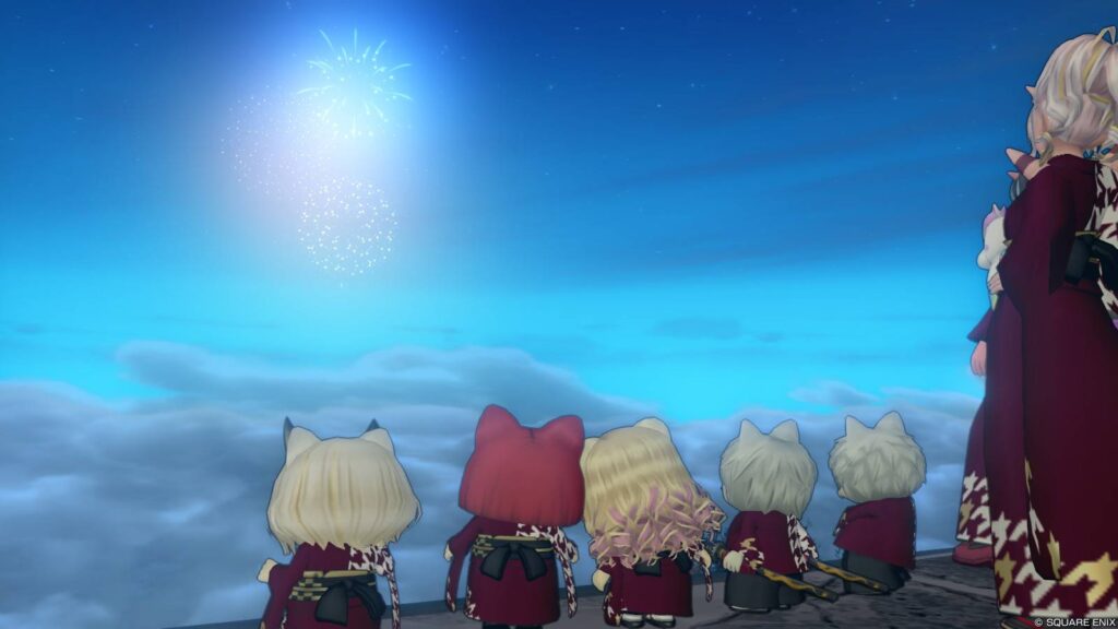 カウントダウンを済ませつつ、初日の出を待ちながら花火を上げる面々。ちなみに私は花火を持ってくるのを忘れてしまい、チムメンさんがこっそり手渡してくれなければ、ただ「綺麗な花火ですよ!」と叫ぶくらいしかできないところでした!